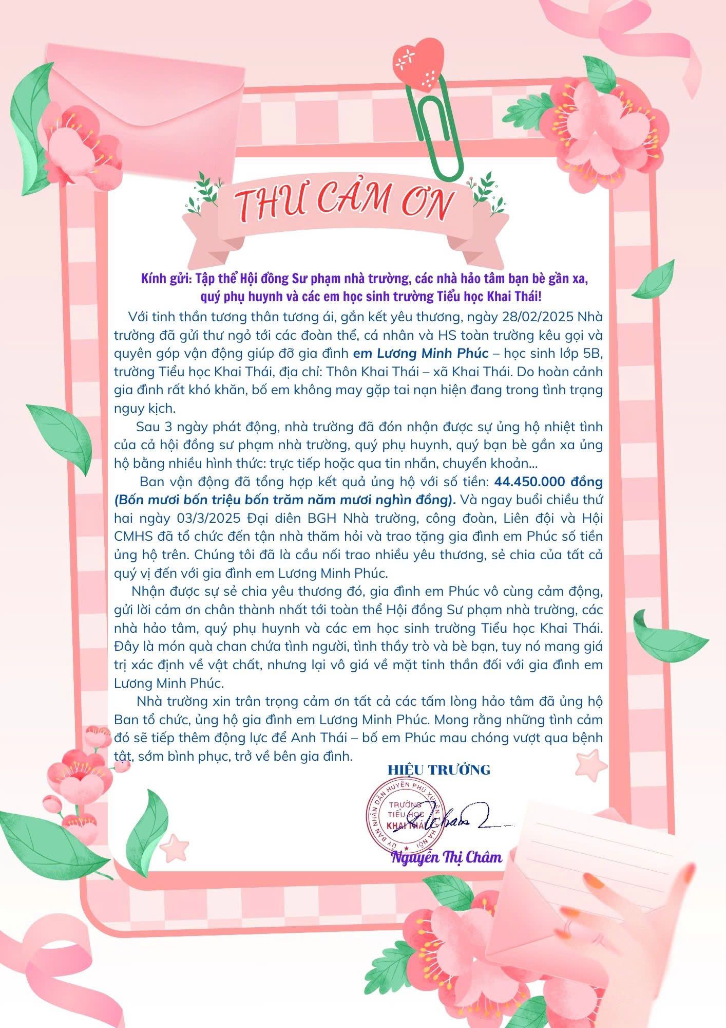 Ngay buổi chiều ngày 3/3/2025, đại diện BGH, Công đoàn, Liên đội và hội CMHS đã đến thăm động viên và trao tặng số tiền ủng hộ trên cho gia đình em Lương Minh Phúc. Nhận được những tình cảm ấm áp đó, gia đình em đã rất xúc động. Thay mặt gia đình, chị Hoa – vợ anh Thái gửi lời cảm ơn chân thành tới các thầy cô giáo, các nhà hảo tâm gần xa, các bậc phụ huynh và các cháu học sinh trường Tiểu học Khai Thái.
